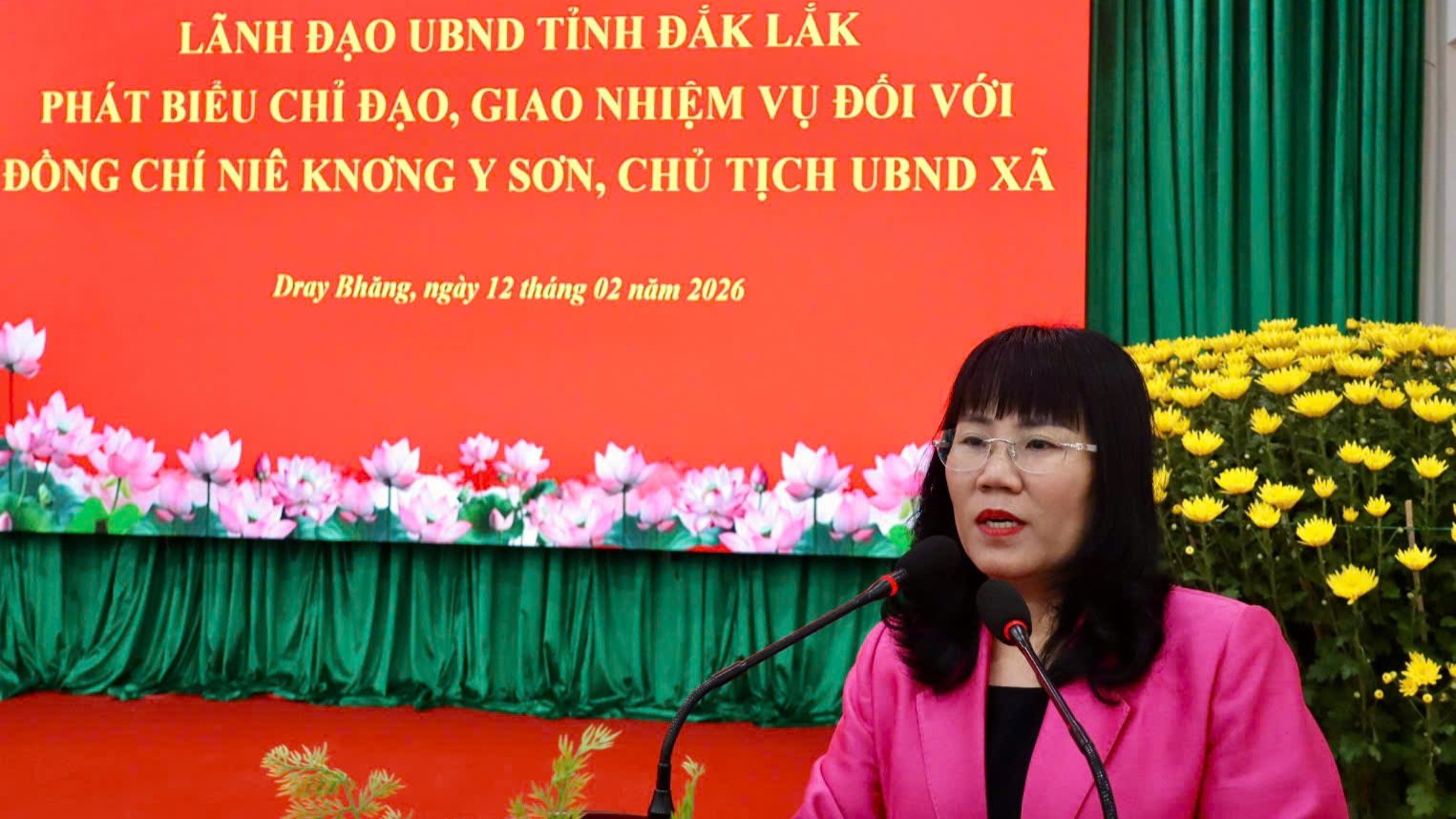 Đồng chí Hồ Thị Nguyên Thảo – Ủy viên Ban Thường vụ Tỉnh ủy, Phó Chủ tịch Thường trực UBND tỉnh Đắk Lắk phát biểu tại lễ trao Quyết định bổ nhiệm Chủ tịch UBND xã Dray Bhăng, nhiệm kỳ 2021 – 2026.