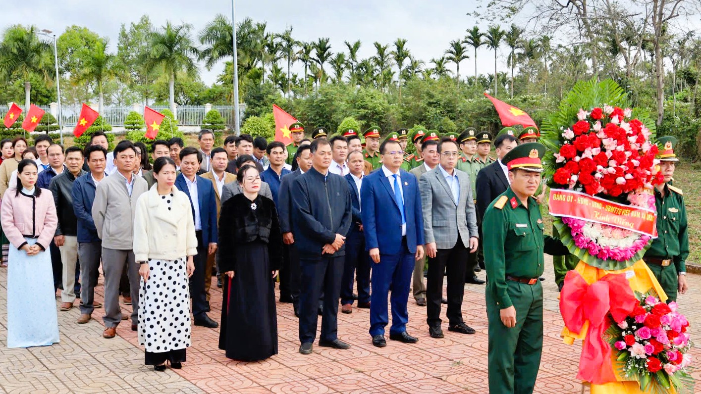 Lãnh đạo và đại biểu xã Dray Bhăng thành kính đặt vòng hoa, dâng hương tại Tượng đài Tổ quốc ghi công ở Nghĩa trang Liệt sĩ xã.
